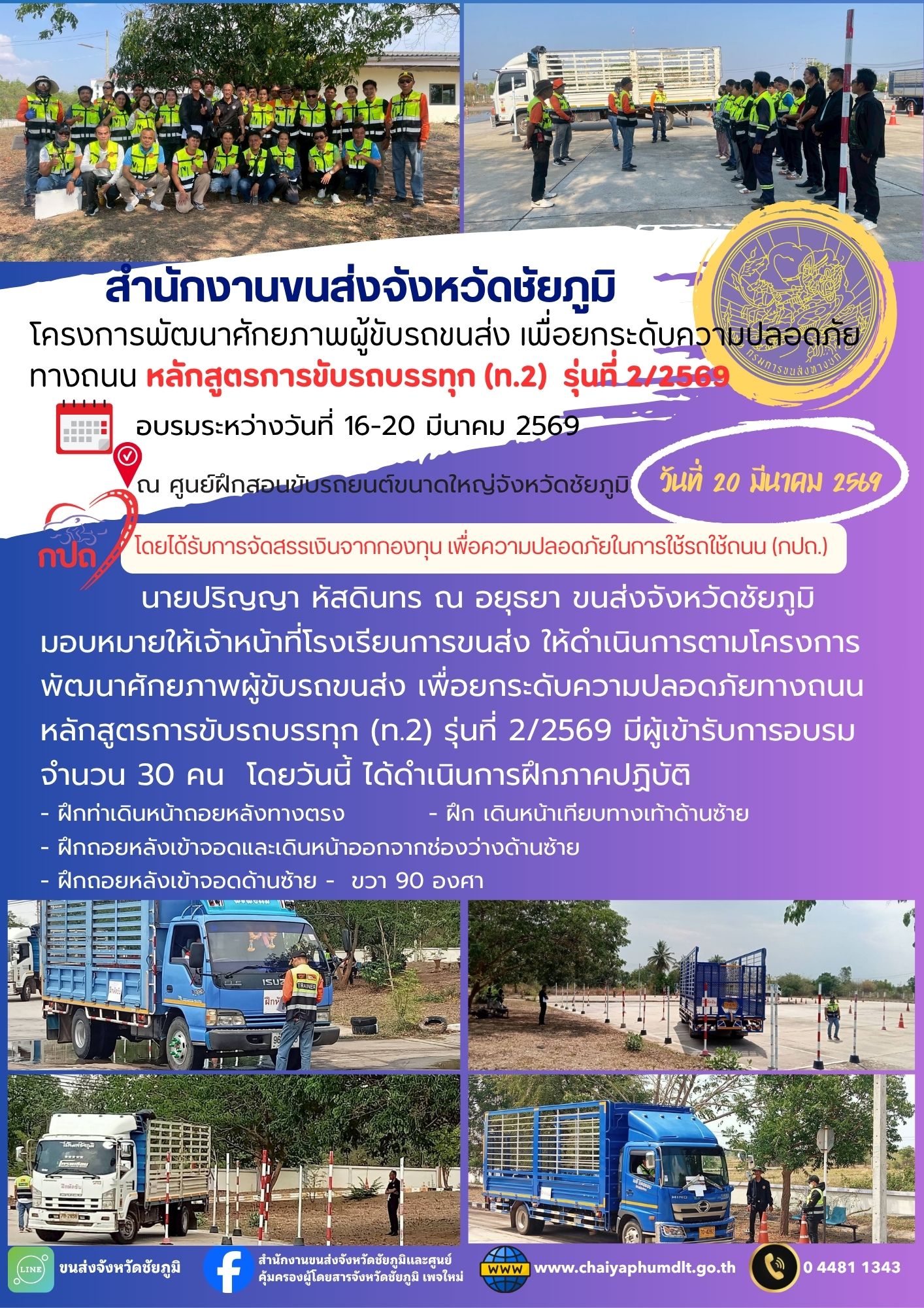 สำนักงานขนส่งจังหวัดชัยภูมิ โดย นายปริญญา หัสดินทร ณ อยุธยา ขนส่งจังหวัดชัยภูมิ มอบหมายให้เจ้าหน้าที่โรงเรียนการขนส่ง ให้ดำเนินการตามโครงการพัฒนาศักยภาพผู้ขับรถขนส่ง เพื่อยกระดับความปลอดภัยทางถนน หลักสูตรการขับรถบรรทุก (ท.2) รุ่นที่ 2/2569 โดยได้รับการจัดสรรเงินจากกองทุนเพื่อความปลอดภัยในการใช้รถใช้ถนน (กปถ.) ในการนี้ ได้ดำเนินการบูรณาการร่วมกับสำนักงานพัฒนาฝีมือแรงงานชัยภูมิ อบรมระหว่างวันที่ 16-20 มีนาคม 2569