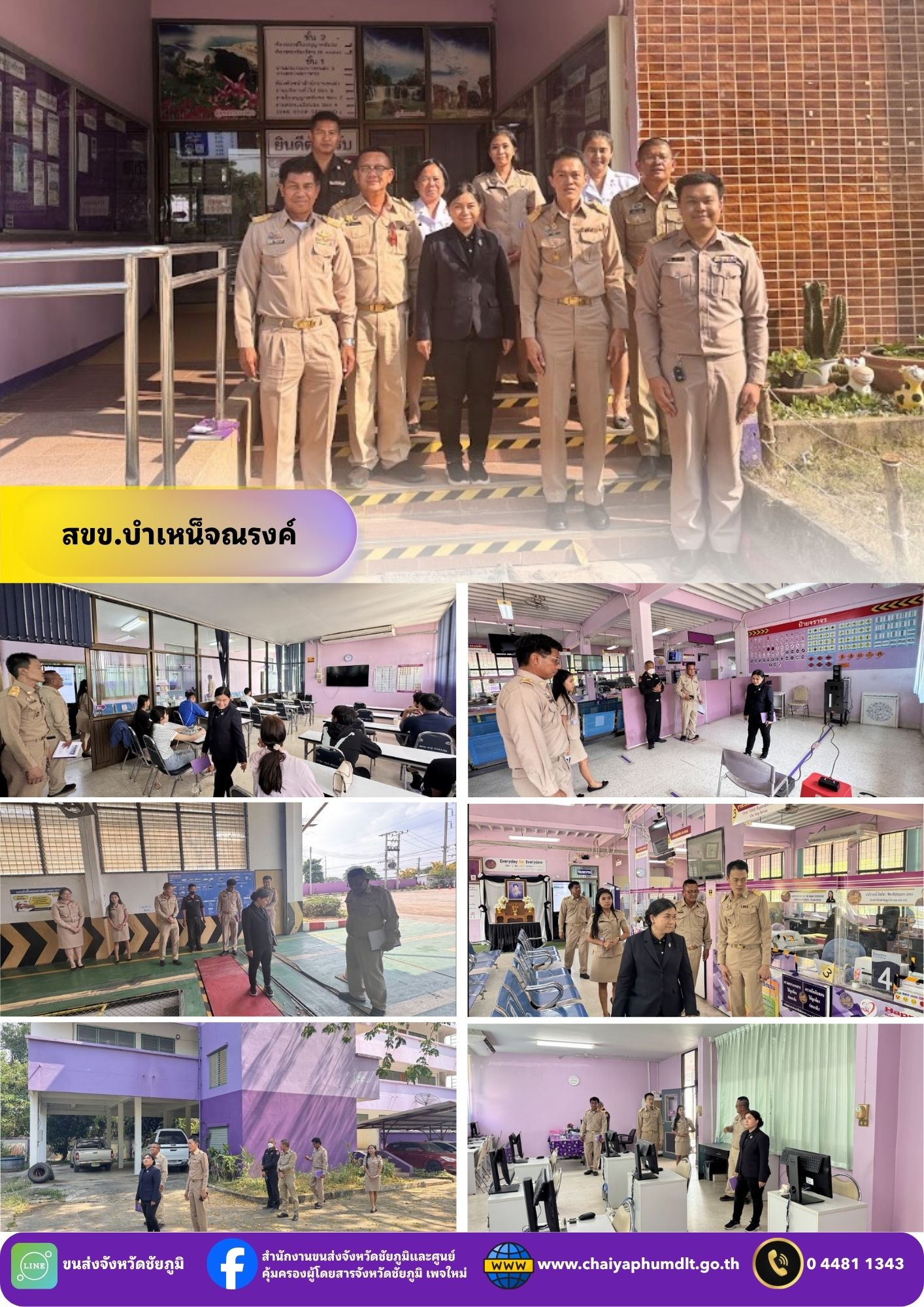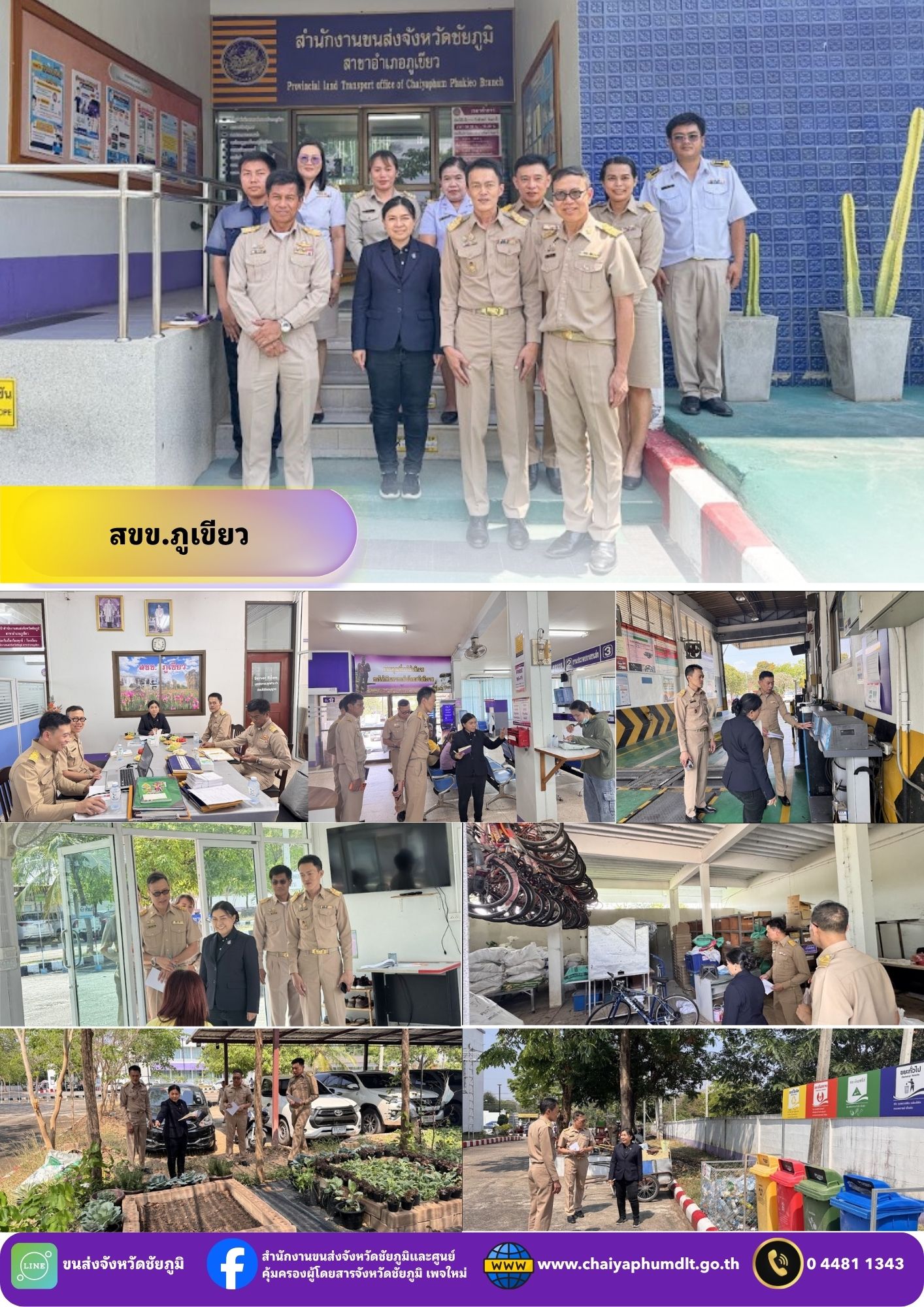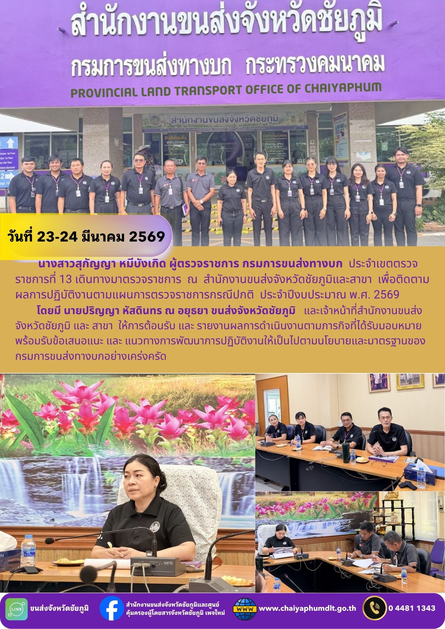 วันที่ 23 – 24 มีนาคม 2569 นางสาวสุกัญญา หมีบังเกิด ผู้ตรวจราชการ กรมการขนส่งทางบก ประจำเขตตรวจราชการที่ 13 เดินทางมาตรวจราชการ ณ สำนักงานขนส่งจังหวัดชัยภูมิ และ สาขา เพื่อติดตามผลการปฏิบัติงานตามแผนการตรวจราชการกรณีปกติ ประจำปีงบประมาณ พ.ศ. 2569 โดยมี นายปริญญา หัสดินทร ณ อยุธยา ขนส่งจังหวัดชัยภูมิ และเจ้าหน้าที่สำนักงานขนส่งจังหวัดชัยภูมิ ให้การต้อนรับ และ รายงานผลการดำเนินงานตามภารกิจที่ได้รับมอบหมาย พร้อมรับข้อเสนอแนะ และ แนวทางการพัฒนาการปฏิบัติงานให้เป็นไปตามนโยบายและมาตรฐานของกรมการขนส่งทางบกอย่างเคร่งครัด
