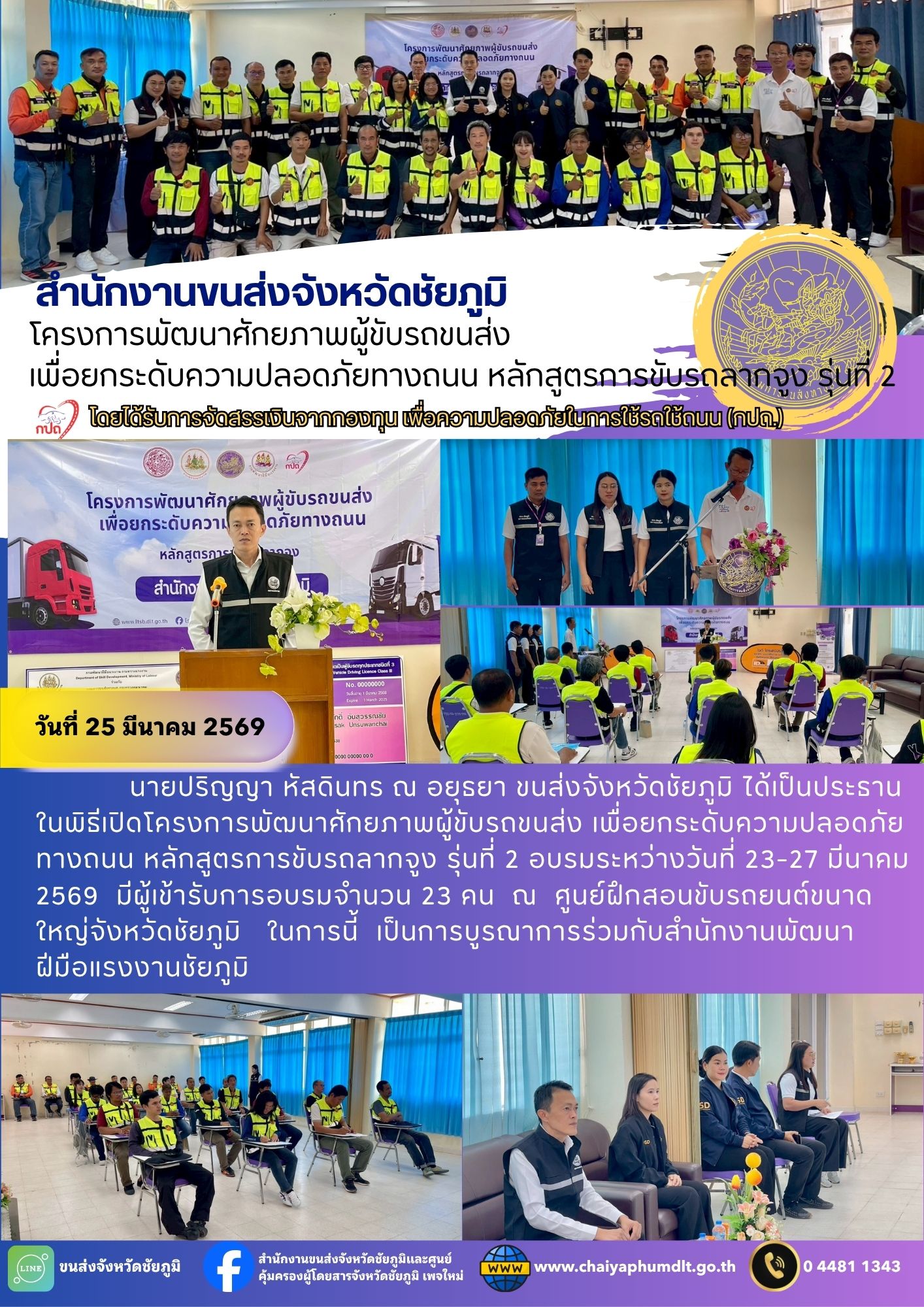 สำนักงานขนส่งจังหวัดชัยภูมิ โดย นายปริญญา หัสดินทร ณ อยุธยา ขนส่งจังหวัดชัยภูมิ ได้เป็นประธานในพิธีเปิดโครงการพัฒนาศักยภาพผู้ขับรถขนส่ง เพื่อยกระดับความปลอดภัยทางถนน หลักสูตรการขับรถลากจูง รุ่นที่ 2 อบรมระหว่างวันที่ 23-27 มีนาคม 2569 มีผู้เข้ารับการอบรมจำนวน 23 คน ณ ศูนย์ฝึกสอนขับรถยนต์ขนาดใหญ่จังหวัดชัยภูมิ ในการนี้ เป็นการบูรณาการร่วมกับสำนักงานพัฒนาฝีมือแรงงานชัยภูมิ โดยได้รับการจัดสรรเงินจากกองทุนเพื่อความปลอดภัยในการใช้รถใช้ถนน (กปถ.)