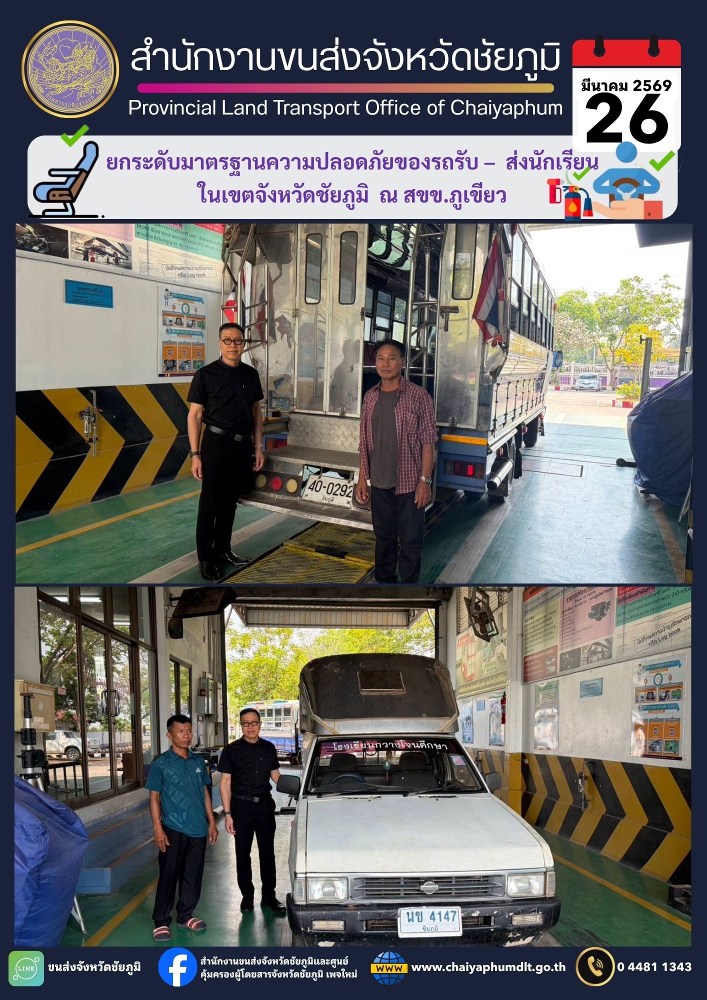 สำนักงานขนส่งจังหวัดชัยภูมิ โดย นายปริญญา หัสดินทร ณ อยุธยา ขนส่งจังหวัดชัยภูมิ มอบหมายให้เจ้าหน้าที่สำนักงานขนส่งจังหวัดชัยภูมิ และ สาขา ลงพื้นที่ออกประชาสัมพันธ์ในการยกระดับมาตรฐานความปลอดภัยของรถรับ – ส่งนักเรียนในเขตจังหวัดชัยภูมิ พร้อมทั้ง อำนวยความสะดวกแก่ผู้ประกอบการรถรับ-ส่งนักเรียน ในการนำรถเข้ารับการตรวจสภาพรถ ได้แก่ ระบบห้ามล้อ ระบบบังคับเลี้ยว เบาะที่นั่ง อุปกรณ์ส่วนควบ ความมั่นคงแข็งแรงของตัวรถ และอุปกรณ์ความปลอดภัยต่างๆ ณ ฝ่ายตรวจสภาพรถ สำนักงานขนส่งจังหวัดชัยภูมิ และสาขา