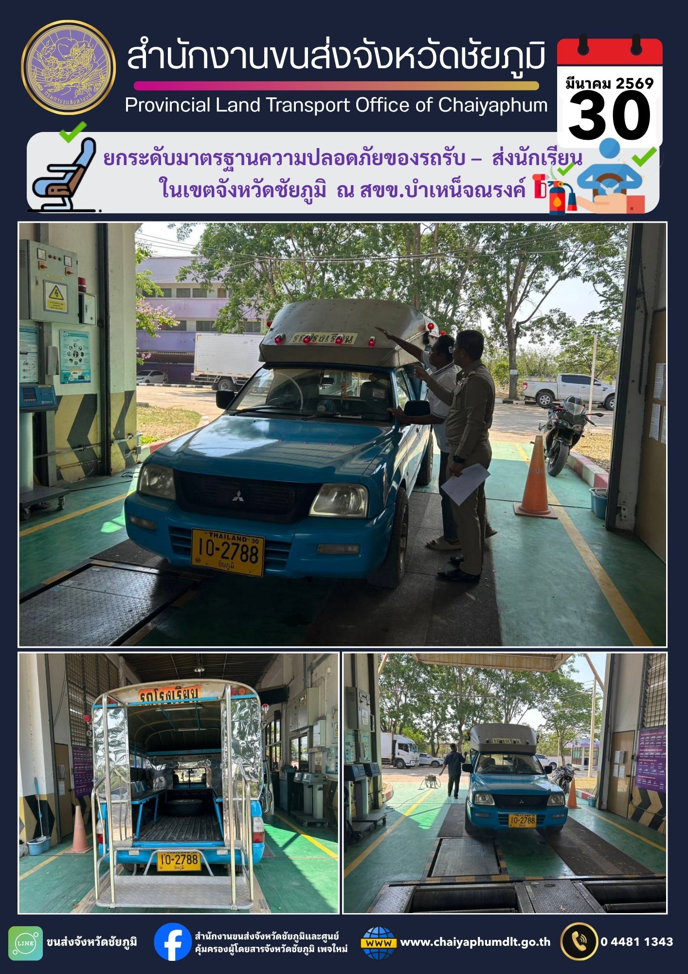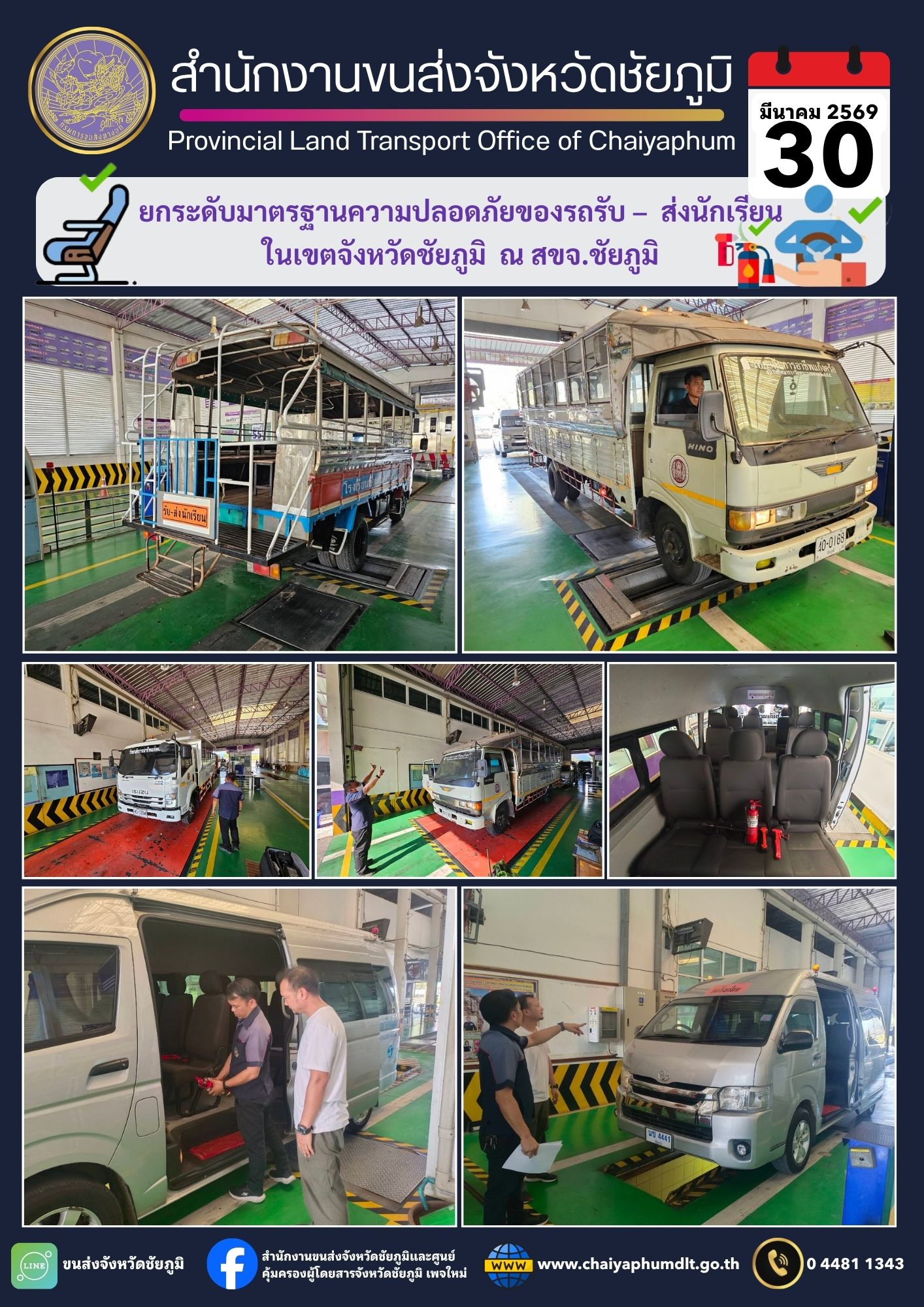 สำนักงานขนส่งจังหวัดชัยภูมิ โดย นายปริญญา หัสดินทร ณ อยุธยา ขนส่งจังหวัดชัยภูมิ มอบหมายให้เจ้าหน้าที่สำนักงานขนส่งจังหวัดชัยภูมิ และ สาขา ลงพื้นที่ออกประชาสัมพันธ์ในการยกระดับมาตรฐานความปลอดภัยของรถรับ – ส่งนักเรียนในเขตจังหวัดชัยภูมิ พร้อมทั้ง อำนวยความสะดวกแก่ผู้ประกอบการรถรับ-ส่งนักเรียน ในการนำรถเข้ารับการตรวจสภาพรถ ได้แก่ ระบบห้ามล้อ ระบบบังคับเลี้ยว เบาะที่นั่ง อุปกรณ์ส่วนควบ ความมั่นคงแข็งแรงของตัวรถ และอุปกรณ์ความปลอดภัยต่างๆ ณ ฝ่ายตรวจสภาพรถ สำนักงานขนส่งจังหวัดชัยภูมิ และสาขา