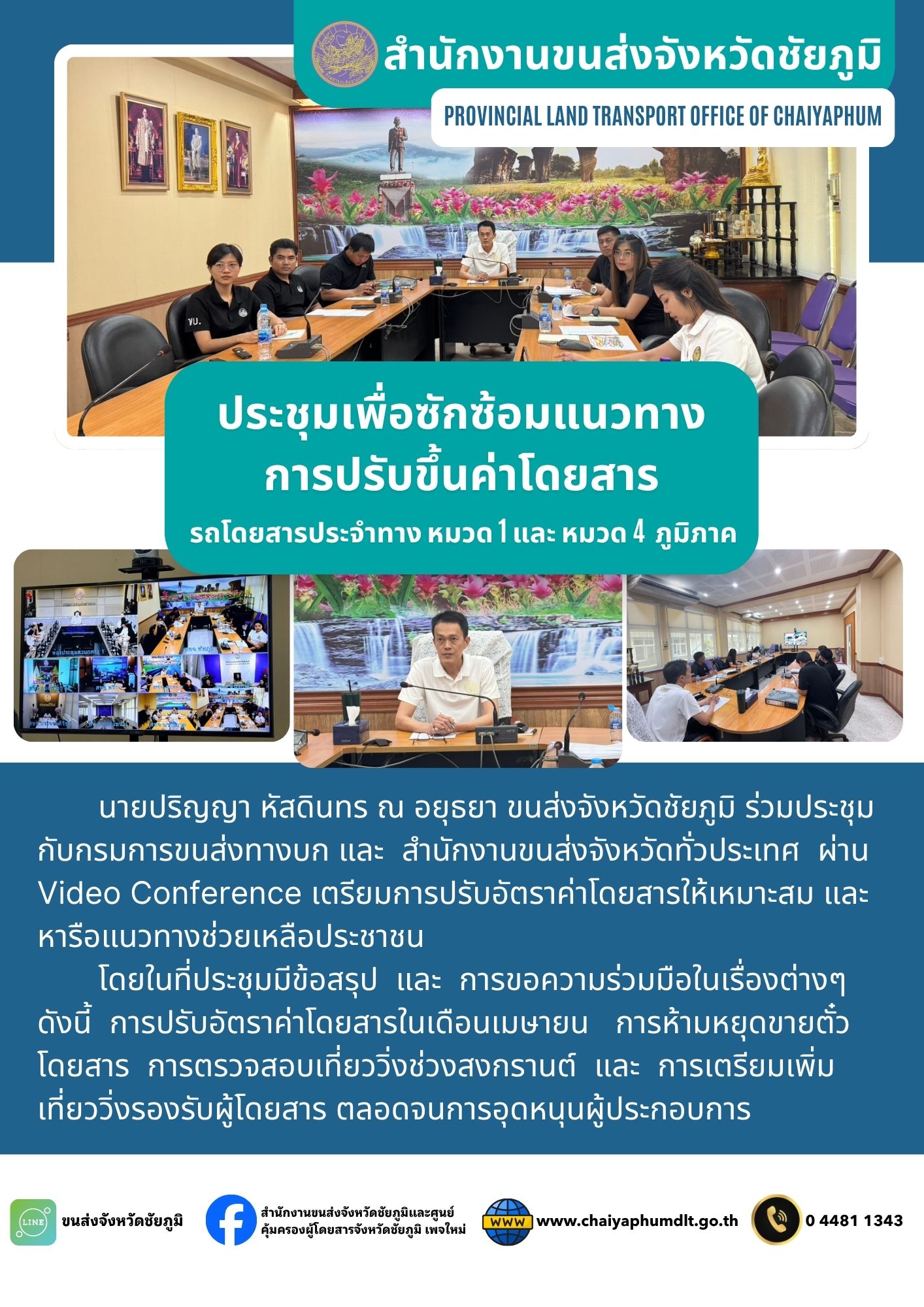 สำนักงานขนส่งจังหวัดชัยภูมิ โดย นายปริญญา หัสดินทร ณ อยุธยา ขนส่งจังหวัดชัยภูมิ ร่วมประชุมกับกรมการขนส่งทางบก และสำนักงานขนส่งจังหวัดทั่วประเทศ ผ่านVideo Conference เตรียมการปรับอัตราค่าโดยสารให้เหมาะสม และหารือแนวทางช่วยเหลือประชาชน โดยในที่ประชุมมีข้อสรุป และการขอความร่วมมือในเรื่องต่างๆ ดังนี้ การปรับอัตราค่าโดยสารในเดือนเมษายน การห้ามหยุดขายตั๋วโดยสาร การตรวจสอบเที่ยววิ่งช่วงสงกรานต์ และการเตรียมเพิ่มเที่ยววิ่งรองรับผู้โดยสาร ตลอดจนการอุดหนุนผู้ประกอบการ