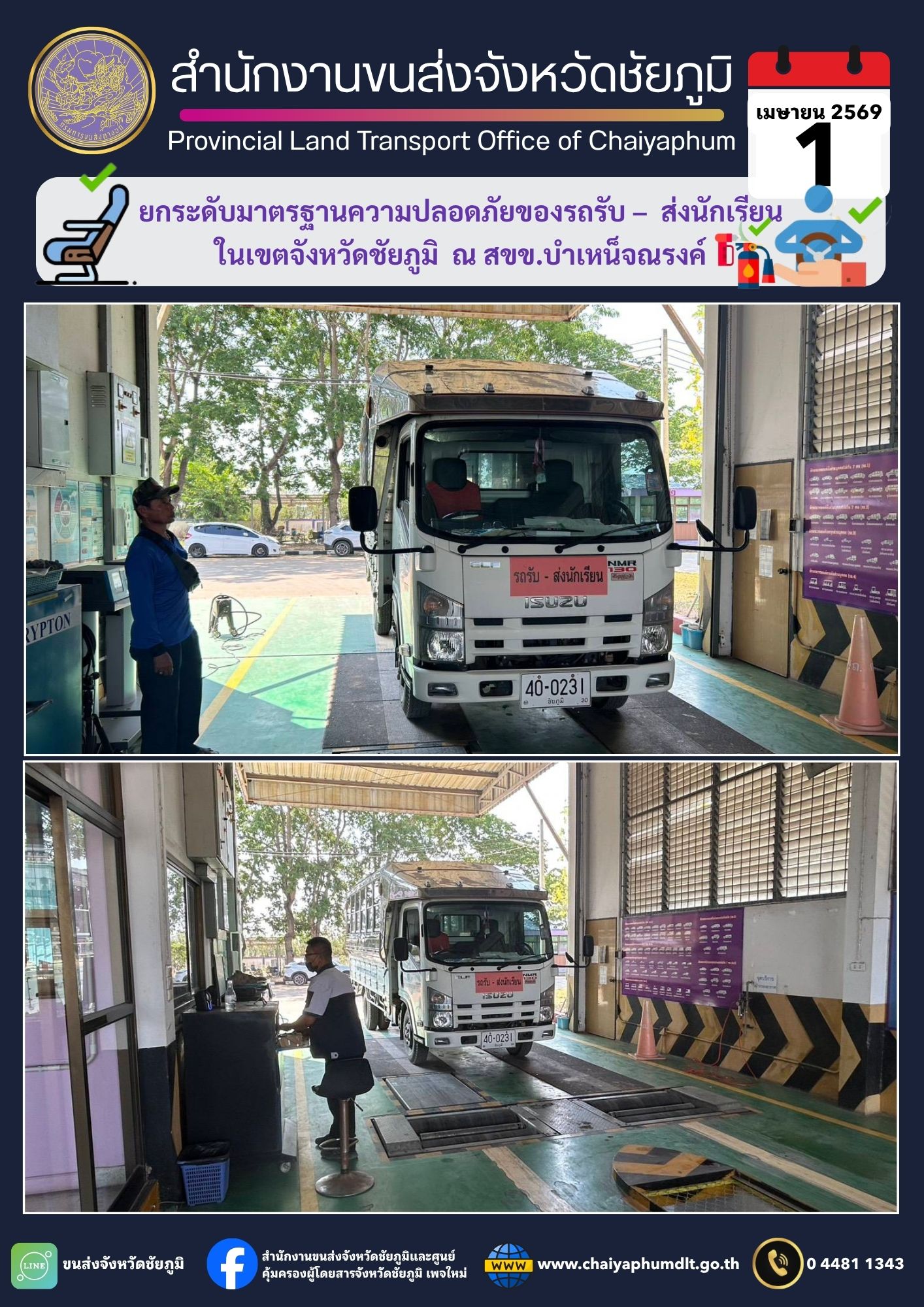 สำนักงานขนส่งจังหวัดชัยภูมิ โดย นายปริญญา หัสดินทร ณ อยุธยา ขนส่งจังหวัดชัยภูมิ มอบหมายให้เจ้าหน้าที่สำนักงานขนส่งจังหวัดชัยภูมิ และ สาขา ลงพื้นที่ออกประชาสัมพันธ์ในการยกระดับมาตรฐานความปลอดภัยของรถรับ – ส่งนักเรียนในเขตจังหวัดชัยภูมิ พร้อมทั้ง อำนวยความสะดวกแก่ผู้ประกอบการรถรับ-ส่งนักเรียน ในการนำรถเข้ารับการตรวจสภาพรถ ได้แก่ ระบบห้ามล้อ ระบบบังคับเลี้ยว เบาะที่นั่ง อุปกรณ์ส่วนควบ ความมั่นคงแข็งแรงของตัวรถ และอุปกรณ์ความปลอดภัยต่างๆ ณ ฝ่ายตรวจสภาพรถ สำนักงานขนส่งจังหวัดชัยภูมิ และสาขา