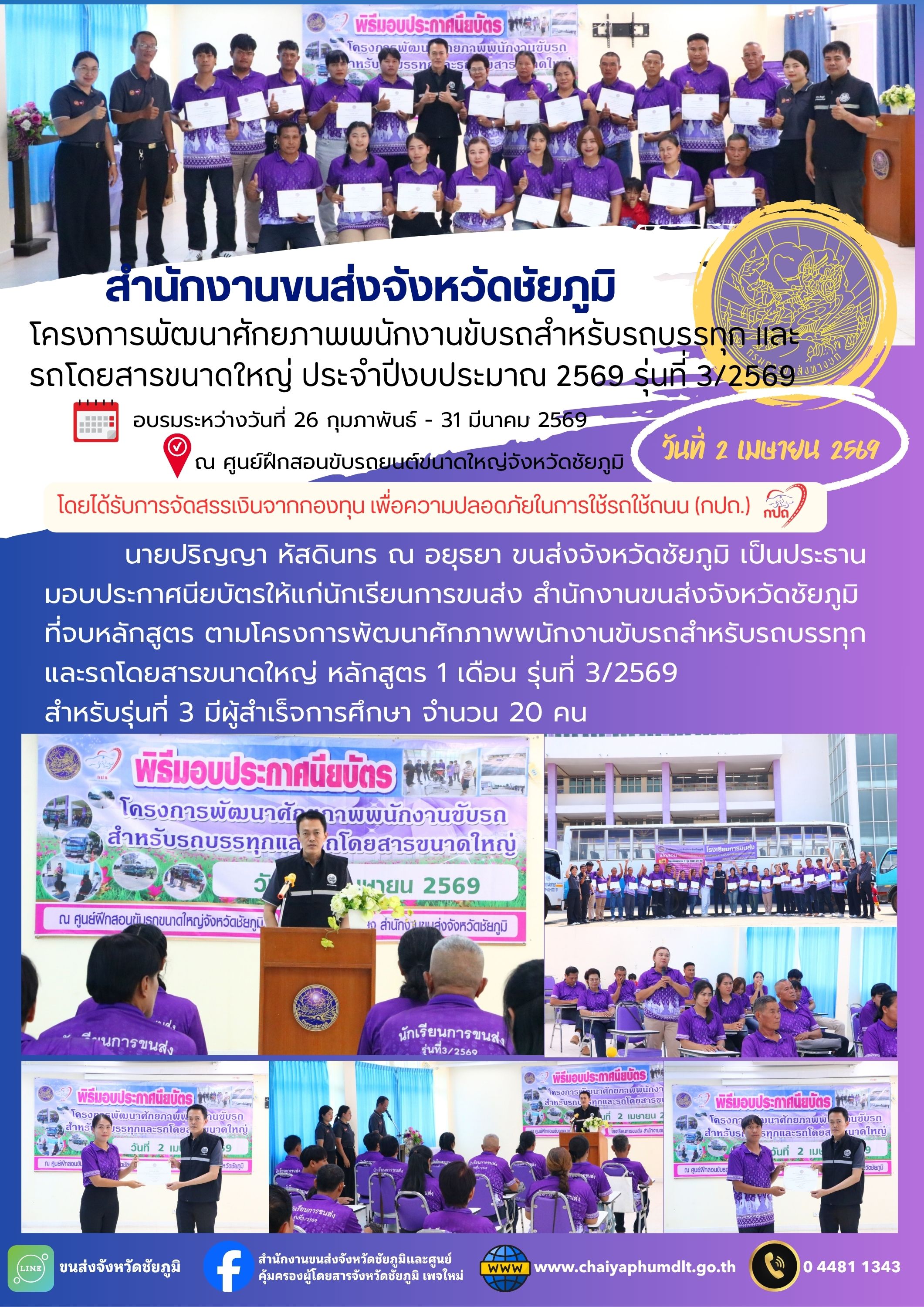 สำนักงานขนส่งจังหวัดชัยภูมิ โดย นายปริญญา หัสดินทร ณ อยุธยา ขนส่งจังหวัดชัยภูมิ เป็นประธานมอบประกาศนียบัตรให้แก่นักเรียนการขนส่ง สำนักงานขนส่งจังหวัดชัยภูมิ ที่จบหลักสูตร ตามโครงการพัฒนาศักภาพพนักงานขับรถสำหรับรถบรรทุกและรถโดยสารขนาดใหญ่ หลักสูตร 1 เดือน รุ่นที่ 3/2569 สำหรับรุ่นที่ 3 มีผู้สำเร็จการศึกษา จำนวน 20 คน