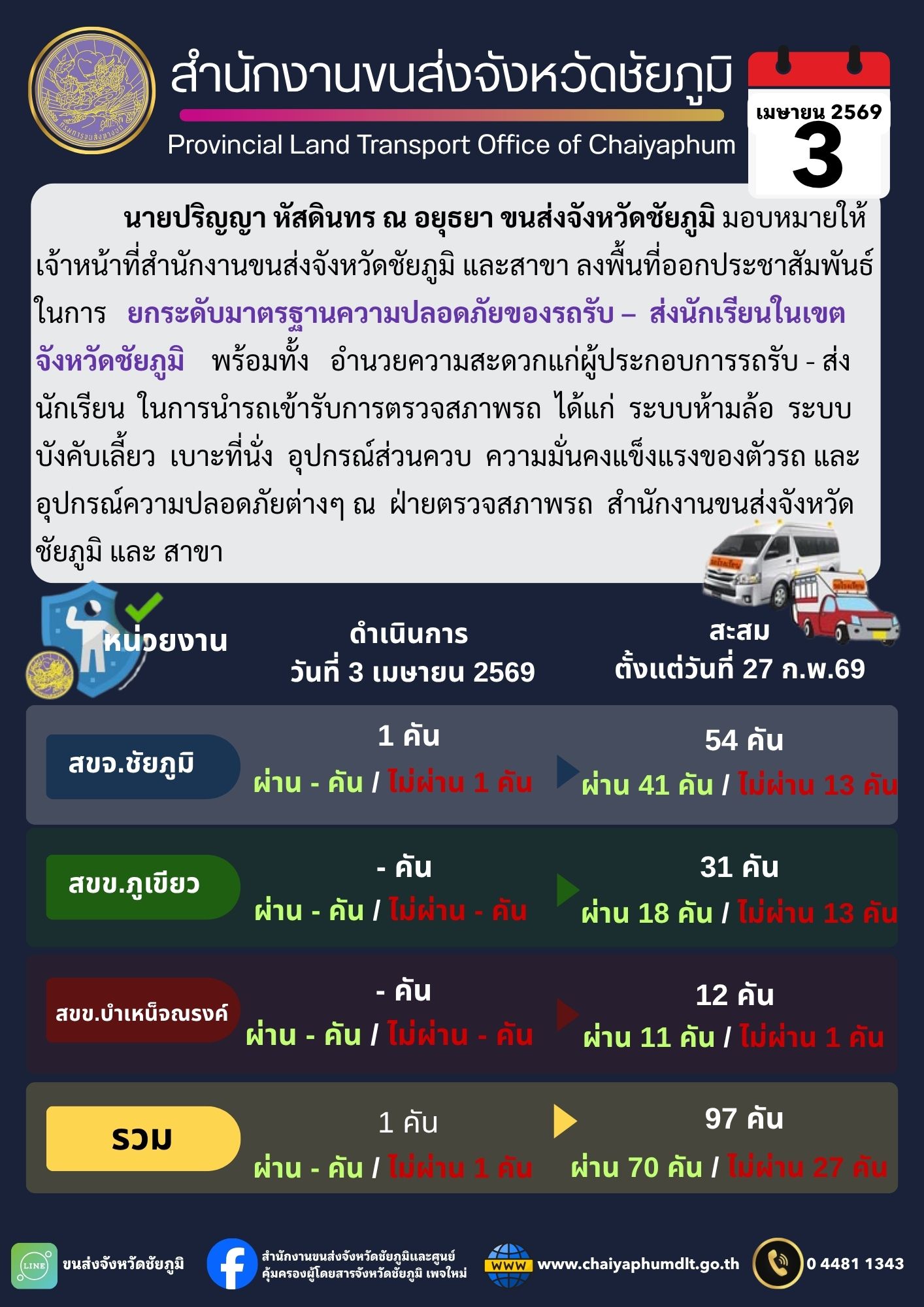 สำนักงานขนส่งจังหวัดชัยภูมิ โดย นายปริญญา หัสดินทร ณ อยุธยา ขนส่งจังหวัดชัยภูมิ มอบหมายให้เจ้าหน้าที่สำนักงานขนส่งจังหวัดชัยภูมิ และ สาขา ลงพื้นที่ออกประชาสัมพันธ์ในการยกระดับมาตรฐานความปลอดภัยของรถรับ – ส่งนักเรียนในเขตจังหวัดชัยภูมิ พร้อมทั้ง อำนวยความสะดวกแก่ผู้ประกอบการรถรับ-ส่งนักเรียน ในการนำรถเข้ารับการตรวจสภาพรถ ได้แก่ ระบบห้ามล้อ ระบบบังคับเลี้ยว เบาะที่นั่ง อุปกรณ์ส่วนควบ ความมั่นคงแข็งแรงของตัวรถ และอุปกรณ์ความปลอดภัยต่างๆ ณ ฝ่ายตรวจสภาพรถ สำนักงานขนส่งจังหวัดชัยภูมิ และสาขา