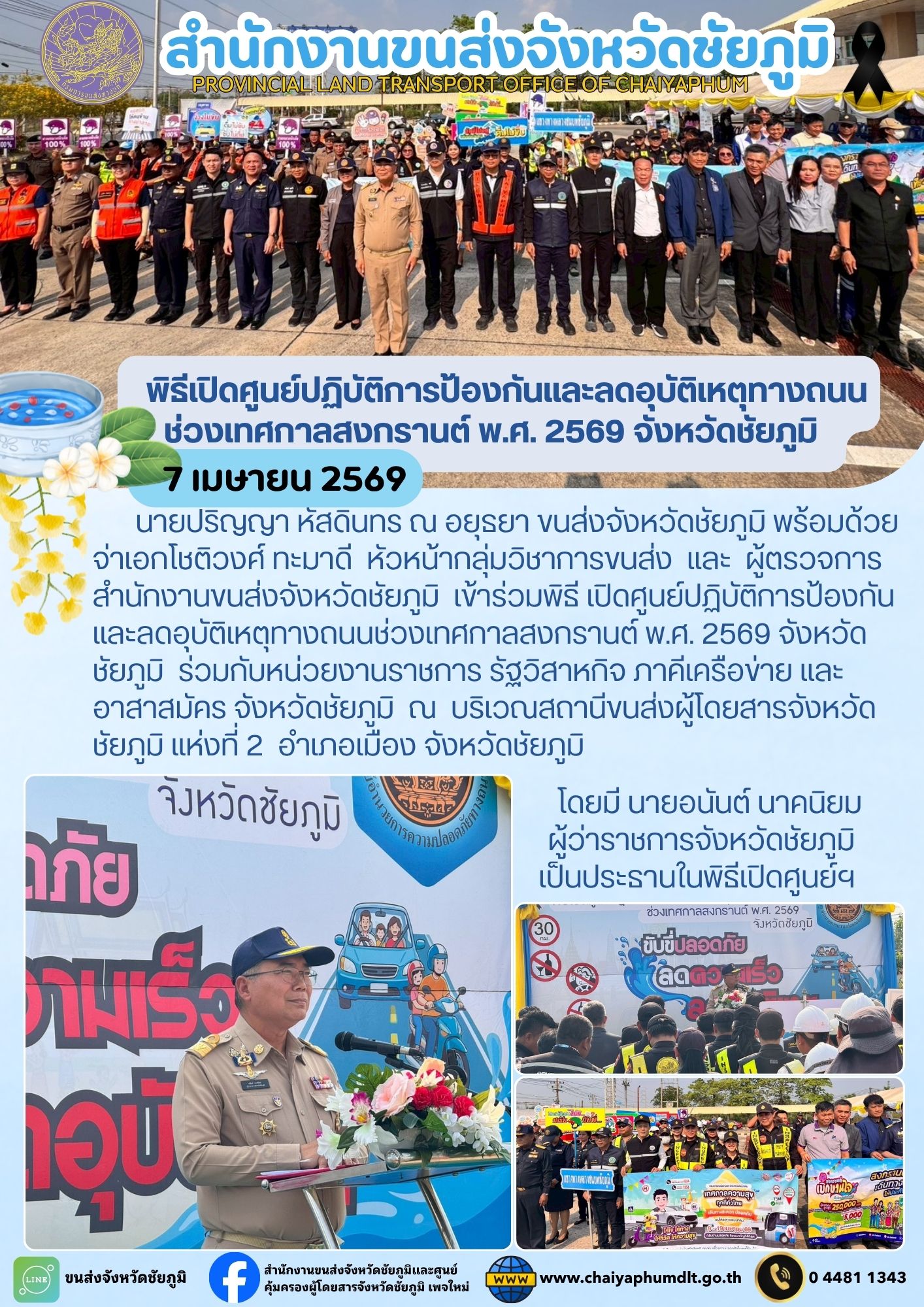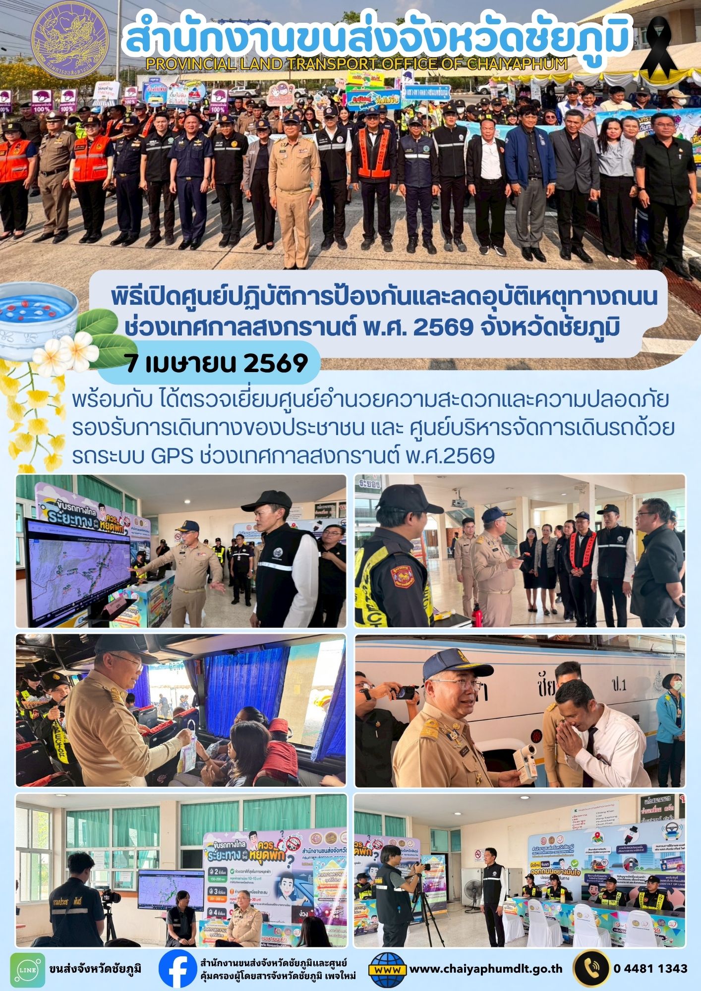 สำนักงานขนส่งจังหวัดชัยภูมิ โดย นายปริญญา หัสดินทร ณ อยุธยา ขนส่งจังหวัดชัยภูมิ พร้อมด้วย จ่าเอกโชติวงศ์ ทะมาดี หัวหน้ากลุ่มวิชาการขนส่ง และ ผู้ตรวจการ สำนักงานขนส่งจังหวัดชัยภูมิ เข้าร่วมพิธีเปิดศูนย์ปฏิบัติการป้องกันและลดอุบัติเหตุทางถนนช่วงเทศกาลสงกรานต์ พ.ศ. 2569 จังหวัดชัยภูมิ ร่วมกับหน่วยงานราชการ รัฐวิสาหกิจ ภาคีเครือข่าย และอาสาสมัคร จังหวัดชัยภูมิ ณ บริเวณสถานีขนส่งผู้โดยสารจังหวัดชัยภูมิ แห่งที่ 2 อำเภอเมือง จังหวัดชัยภูมิ โดยมี นายอนันต์ นาคนิยม ผู้ว่าราชการจังหวัดชัยภูมิ เป็นประธานในพิธีเปิดศูนย์ฯ พร้อมกับ ได้ตรวจเยี่ยมศูนย์อำนวยความสะดวกและความปลอดภัยรองรับการเดินทางของประชาชน และ ศูนย์บริหารจัดการเดินรถด้วยรถระบบ GPS ช่วงเทศกาลสงกรานต์ พ.ศ.2569