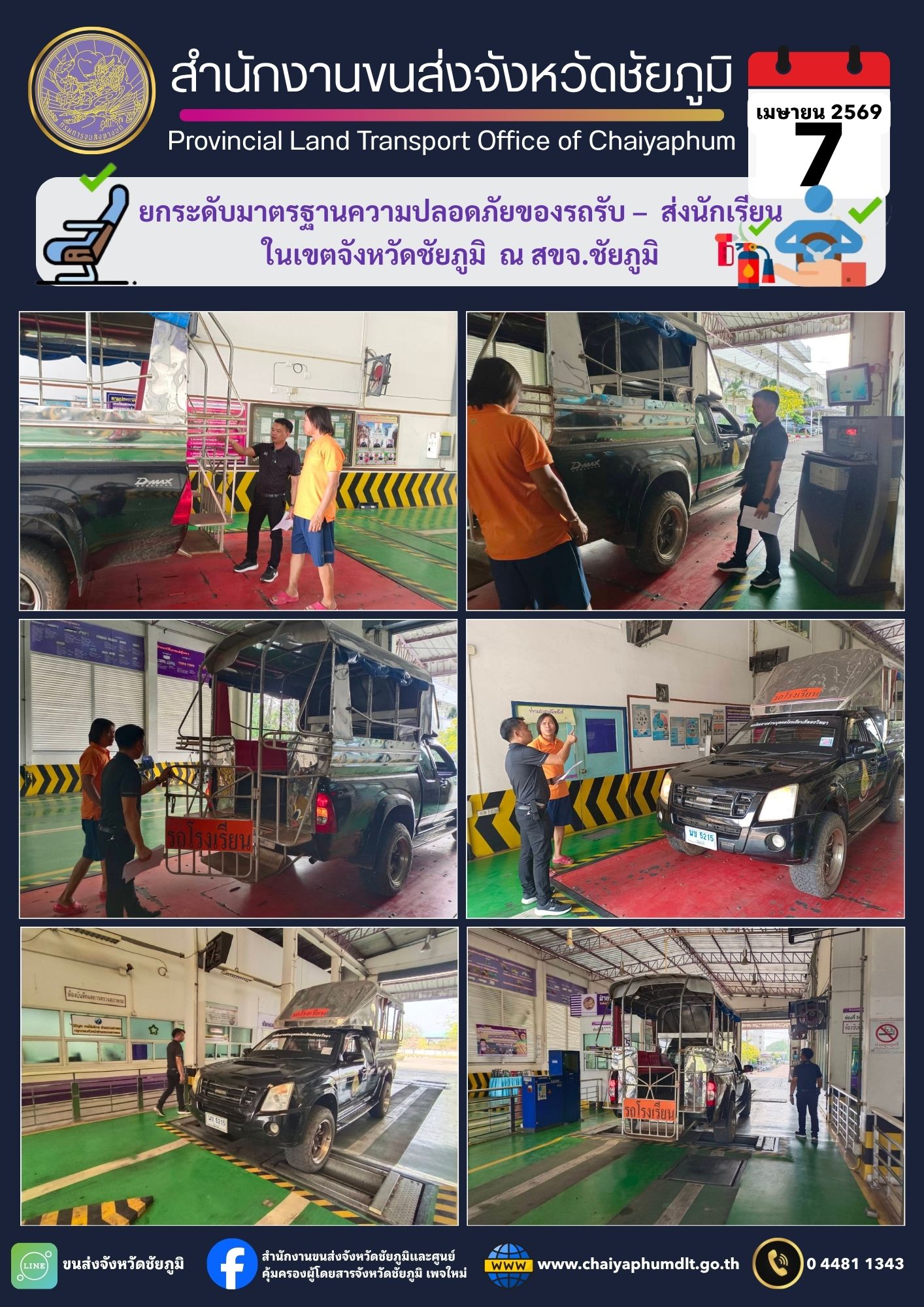 สำนักงานขนส่งจังหวัดชัยภูมิ โดย นายปริญญา หัสดินทร ณ อยุธยา ขนส่งจังหวัดชัยภูมิ มอบหมายให้เจ้าหน้าที่สำนักงานขนส่งจังหวัดชัยภูมิ และ สาขา ลงพื้นที่ออกประชาสัมพันธ์ในการยกระดับมาตรฐานความปลอดภัยของรถรับ – ส่งนักเรียนในเขตจังหวัดชัยภูมิ พร้อมทั้ง อำนวยความสะดวกแก่ผู้ประกอบการรถรับ-ส่งนักเรียน ในการนำรถเข้ารับการตรวจสภาพรถ ได้แก่ ระบบห้ามล้อ ระบบบังคับเลี้ยว เบาะที่นั่ง อุปกรณ์ส่วนควบ ความมั่นคงแข็งแรงของตัวรถ และอุปกรณ์ความปลอดภัยต่างๆ ณ ฝ่ายตรวจสภาพรถ สำนักงานขนส่งจังหวัดชัยภูมิ และสาขา