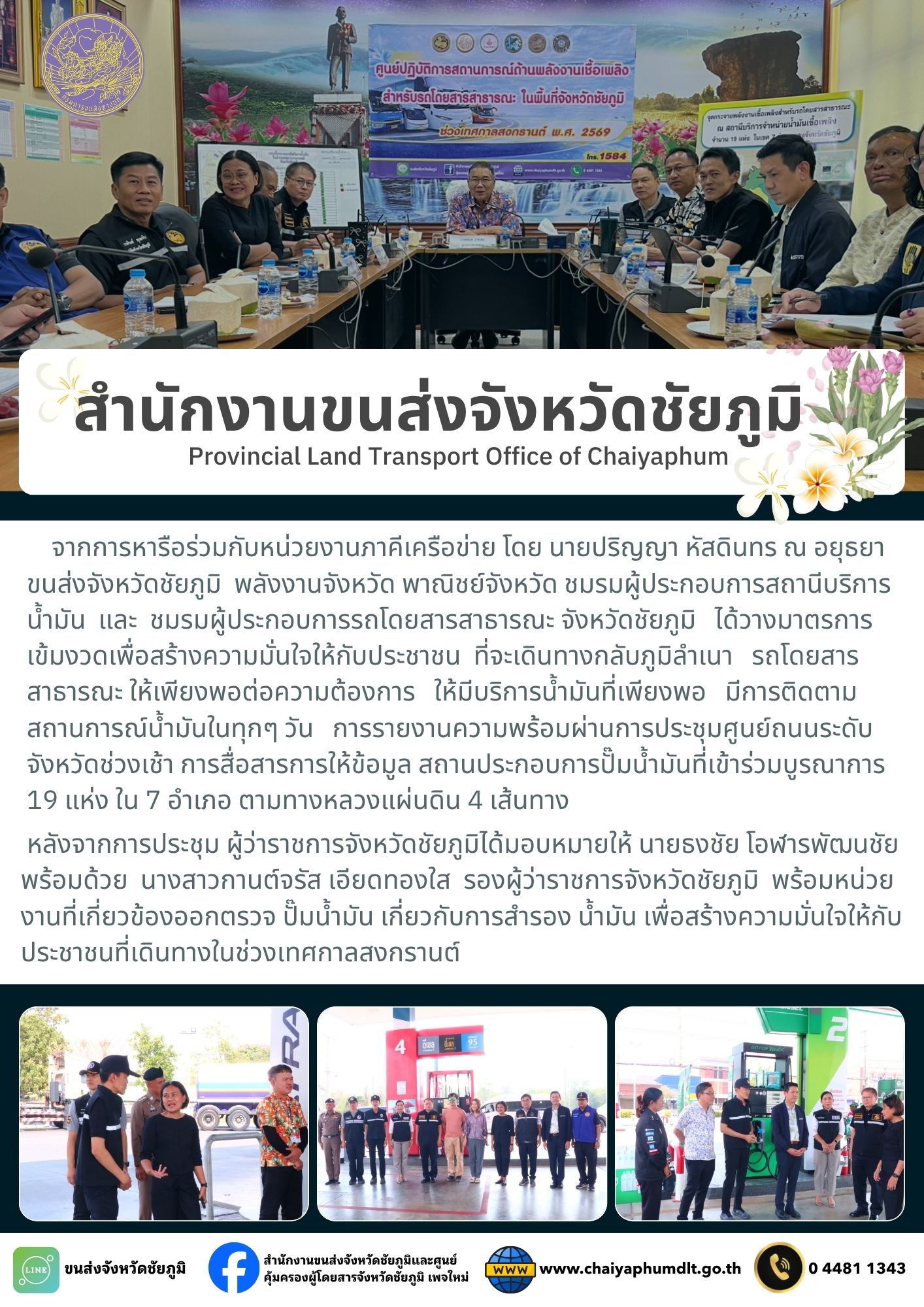 จากการหารือร่วมกับหน่วยงานภาคีเครือข่าย โดย นายปริญญา หัสดินทร ณ อยุธยา ขนส่งจังหวัดชัยภูมิ พลังงานจังหวัด พาณิชย์จังหวัด ชมรมผู้ประกอบการสถานีบริการน้ำมัน และชมรมผู้ประกอบการรถโดยสารสาธารณะ จังหวัดชัยภูมิ ได้วางมาตรการเข้มงวดเพื่อสร้างความมั่นใจให้กับประชาชนที่จะเดินทางกลับภูมิลำเนา โดยสารสาธารณะให้เพียงพอต่อความต้องการ ให้มีบริการน้ำมันที่เพียงพอ มีการติดตามสถานการณ์น้ำมันในทุกๆ วัน การรายงานความพร้อมผ่านการประชุมศูนย์ถนนระดับจังหวัดช่วงเช้า การสื่อสาร การให้ข้อมูล สถานประกอบการปั๊มน้ำมันที่เข้าร่วมบูรณาการ 19 แห่ง ใน 7 อำเภอ ตามทางหลวงแผ่นดิน 4 เส้นทาง