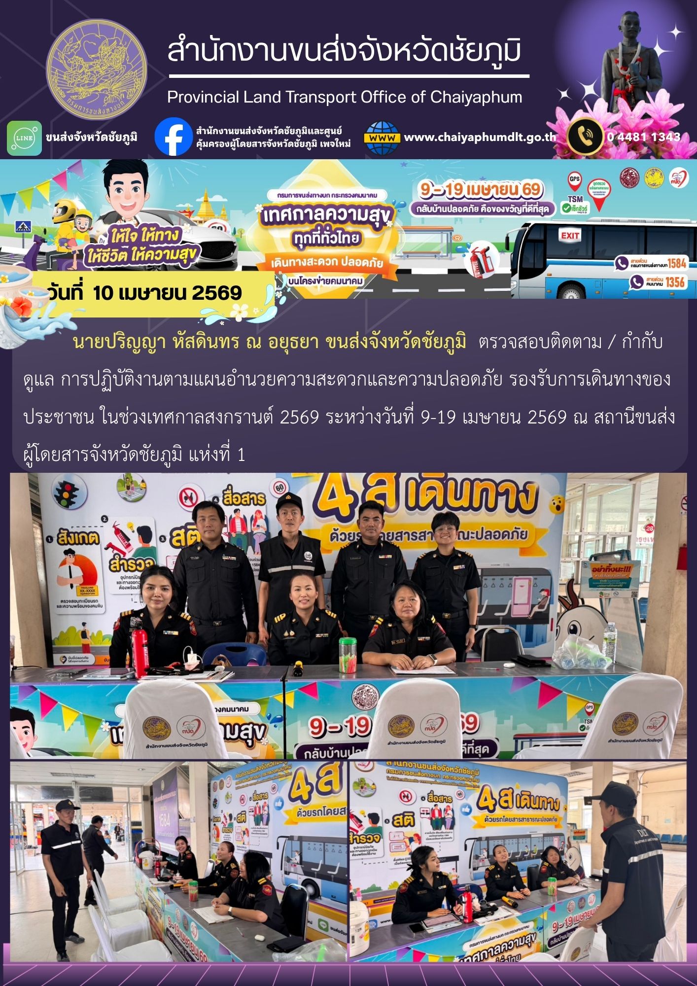 สำนักงานขนส่งจังหวัดชัยภูมิ โดย นายปริญญา หัสดินทร ณ อยุธยา ขนส่งจังหวัดชัยภูมิ ออกตรวจสอบติดตาม / กำกับดูแลการปฏิบัติงาน แผนอำนวยความสะดวกและความปลอดภัย รองรับการเดินทางของประชาชน ในช่วงเทศกาลสงกรานต์ 2569 ระหว่างวันที่ 9-19 เมษายน 2569 ณ สถานีขนส่งผู้โดยสารจังหวัดชัยภูมิ แห่งที่ 1