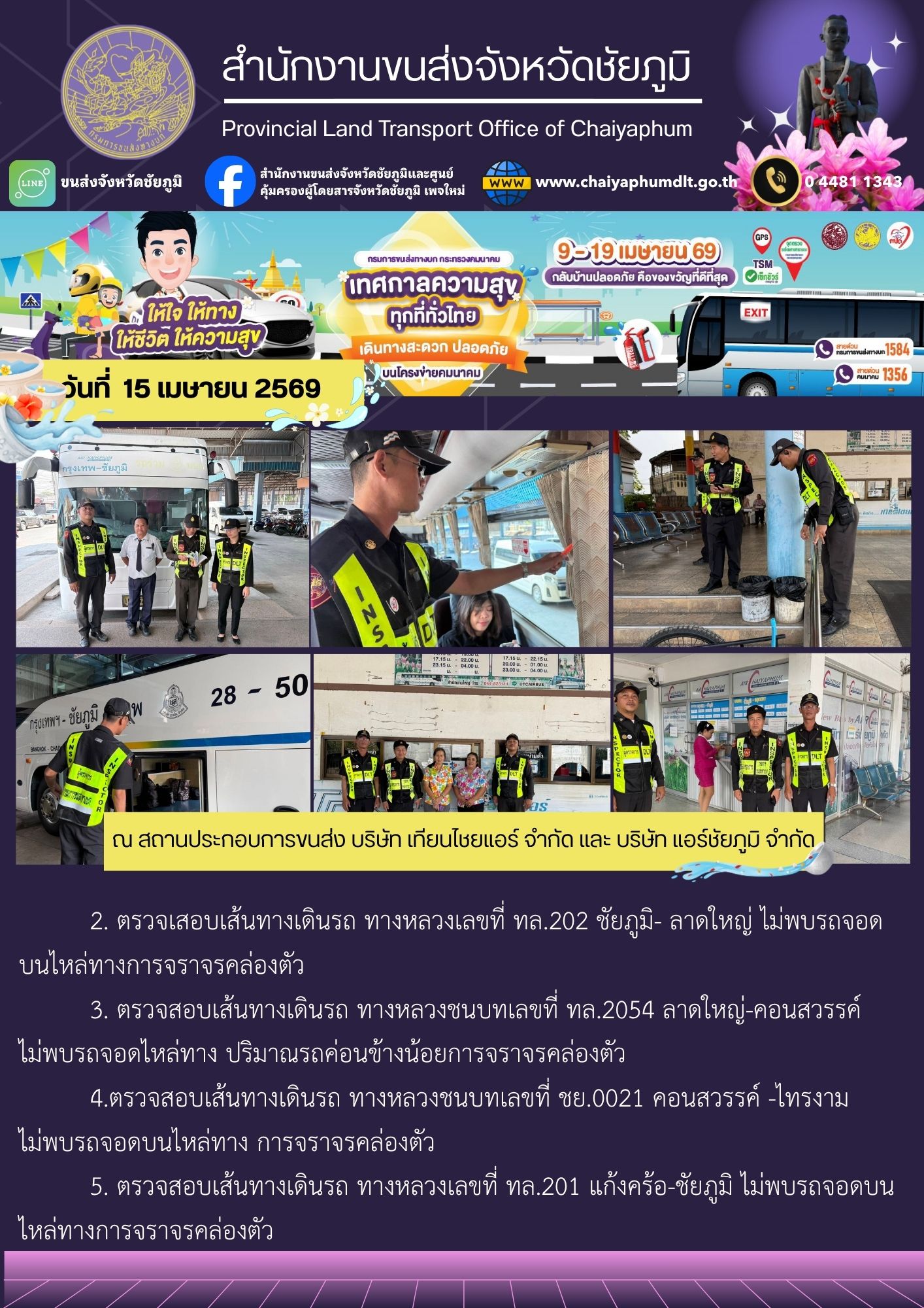 สำนักงานขนส่งจังหวัดชัยภูมิ โดย นายปริญญา หัสดินทร ณ อยุธยา ขนส่งจังหวัดชัยภูมิ มอบหมายให้ ชุดเคลื่อนที่เร็วออกปฏิบัติงานตามดำเนินการตามแผนอำนวยความสะดวกและความปลอดภัย รองรับการเดินทางของประชาชน ในช่วงเทศกาลสงกรานต์ 2569 ระหว่างวันที่ 9-19 เมษายน 2569 ดังนี้