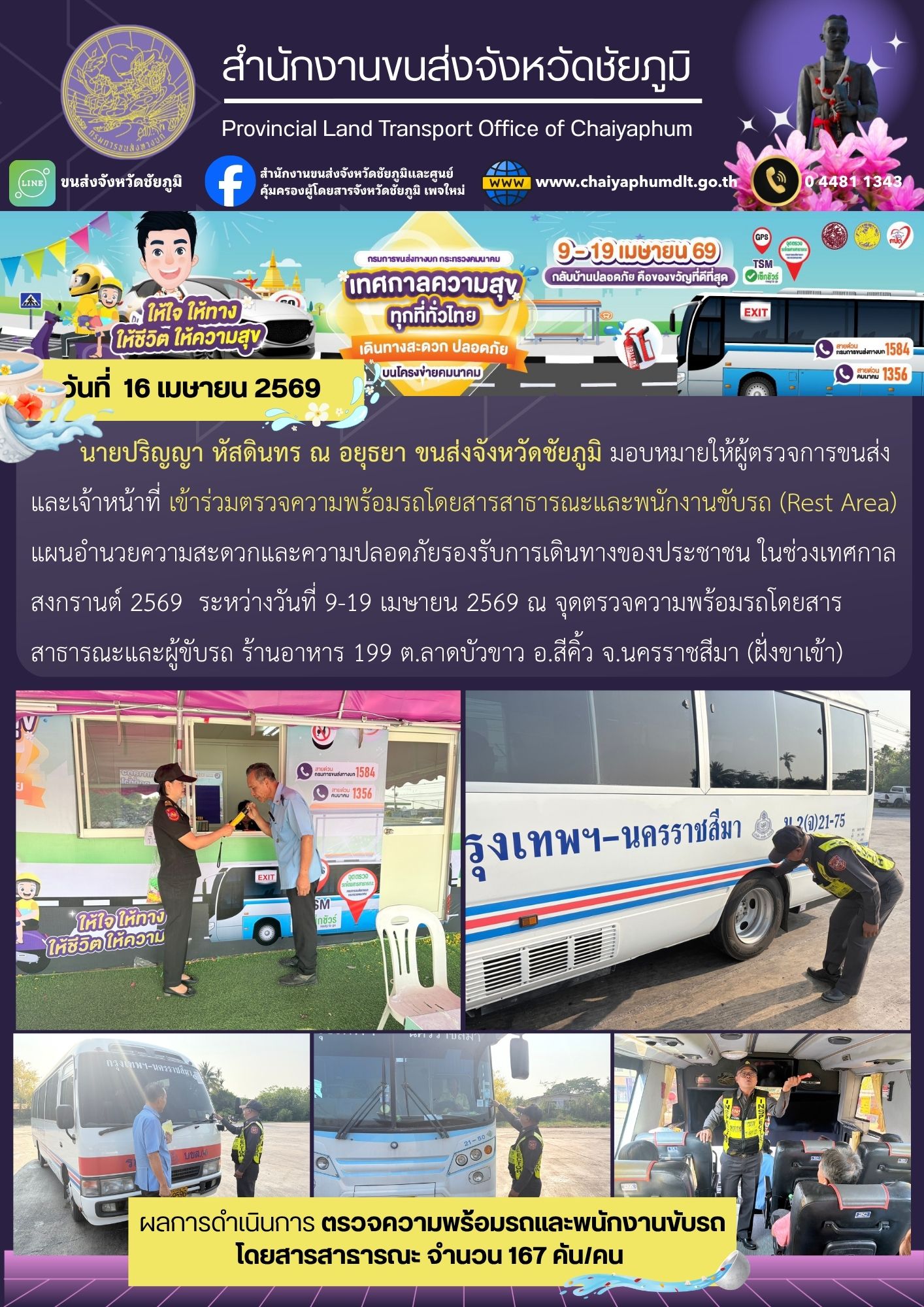 สำนักงานขนส่งจังหวัดชัยภูมิ โดย นายปริญญา หัสดินทร ณ อยุธยา ขนส่งจังหวัดชัยภูมิ มอบหมายให้ผู้ตรวจการขนส่งและเจ้าหน้าที่ เข้าร่วมตรวจความพร้อมรถโดยสารสาธารณะและพนักงานขับรถ (Rest Area) แผนอำนวยความสะดวกและความปลอดภัย รองรับการเดินทางของประชาชน ในช่วงเทศกาลสงกรานต์ 2569 ระหว่างวันที่ 9-19 เมษายน 2569 ณ จุดตรวจความพร้อมรถโดยสารสาธารณะและผู้ขับรถ ร้านอาหาร 199 ต.ลาดบัวขาว อ.สีคิ้ว จ.นครราชสีมา (ฝั่งขาเข้า)
